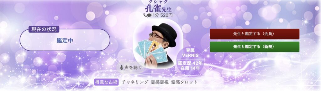 鑑定歴42年の孔雀先生は、人間関係や家庭内の悩みに寄り添う鑑定で高い支持を集めている占い師です。