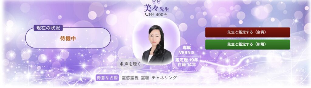 鑑定歴19年の美々先生は、人間関係や家庭内の問題に対して「丁寧で寄り添いのある鑑定」で人気を集める占い師です。